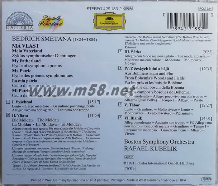Smetana: Ma vlast 斯美塔那:我的祖國 CD(古典愛好者必備)(m58.net) 指揮:Rafael Kubelik 該CD是《我的祖國》的首選版本,這個版本是庫貝利克第二次錄制,比第一次錄制時更具理想且處理得更激動人心,被日本《唱片藝術》評為最佳名曲。 《我的祖國》組曲出自于捷克音樂之父斯美塔那,作曲家以極大的愛國主義熱情譜寫了《我的祖國》組曲,展示了捷克的大好河山,歌頌了捷克的民族英雄。特別是組曲中的“沃爾塔瓦河”完美地展現了捷克的母親河的美,體現了作曲家對母親河的依戀和贊美。這首膾炙人口的“沃爾塔瓦河”也因此成為舉世公認的名曲!