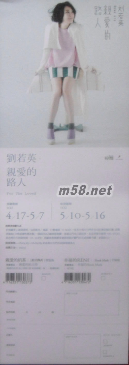 親愛的路人(親愛的奶茶)精裝版(臺灣預(yù)購)(m58.net) 預(yù)購單尺寸:28*10CM(出版日前預(yù)購的才有) 親愛的奶茶[拍立得式]精裝版 預(yù)購限量加贈:[親愛的拍立得]親愛的奶茶拍立得式照片1張 (每張都獨(dú)一無二)隨機(jī)附贈 [親愛的路人] VS. [幸福不是情歌] 奶茶劉若英這張暌違三年的生命情歌專輯【親愛的路人】,累積了她對愛情的體驗(yàn)和領(lǐng)悟。囊括「四大才女」陳綺貞、陳小霞、許哲珮、徐佳瑩的女性真言創(chuàng)作,再由「四大男製作人」鐘成虎、陳建良、張亞東、五月天瑪莎操刀詮釋,曲風(fēng)涵蓋抒情、搖滾、民謠、電音等。雙主打呈現(xiàn)奶茶雙子座的豐富性格,也宣言了專輯的豐富。