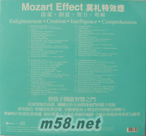 MOZART EFFECT 莫扎特效應4碟(豪華套裝)(m58.net) 專業編排 內附一世保用證書及使用說明手冊 兒童智能的高低,關鍵在于全面開發他們的腦力效能 研究指出,聆聽莫札特音樂,可顯著提升小朋友的空間感及理解力 華納唱片的莫札特效應,經由專業人士作有系統的編排,令增長智能的成效更為顯著