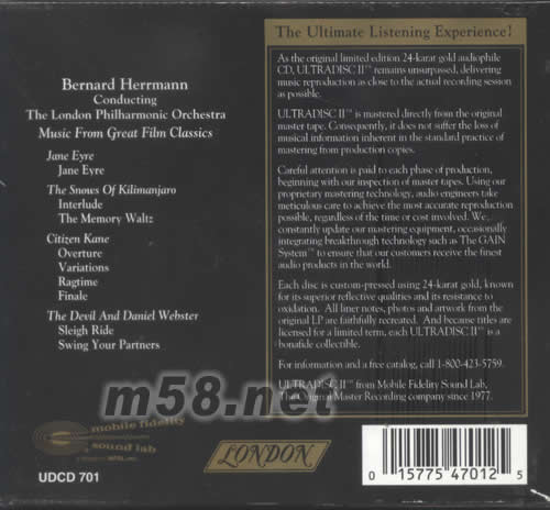 這是一張喜愛氣勢磅礴大編制電影配樂的發燒友,千萬不能錯過的經典名盤!收錄有[簡愛]及[大國民]等巨片最精采的配樂部分,由大師伯納赫曼親自編曲指揮,并結合百人管弦樂團的LIVE錄音.
