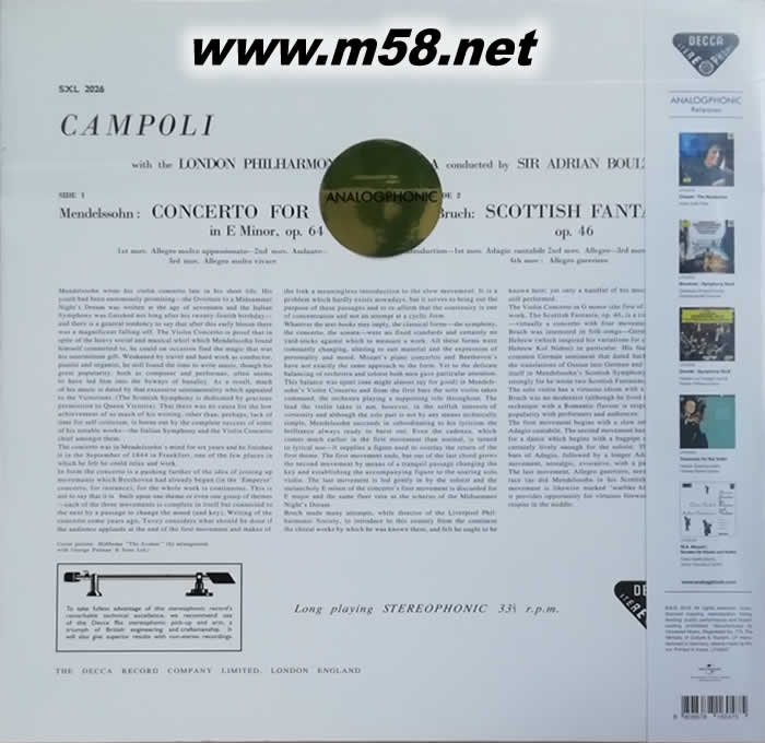 門德爾松 小提琴協奏曲 布魯赫 蘇格蘭幻想曲Mendelssohn:Violin Concerto, Bruch:Scottish Fantasia/Alfredo Campoli, Sir Adrian Boult, 黑膠專輯背面圖片