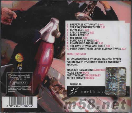 1 BREAKFAST AT TIFFANY'S 2 THE PINK PANTHER THEME 3 ROYAL BLUE 4 SALLY'S TOMATO 5 MOON RIVER 6 MR.LUCKY 7 PIANO AND STRINGS 8 CHAMPAGNE AND QUAIL 9 THE DAYS OF WINE AND HOSES 10 PETER GUNN THEME\BABY ELEPHANT WALK