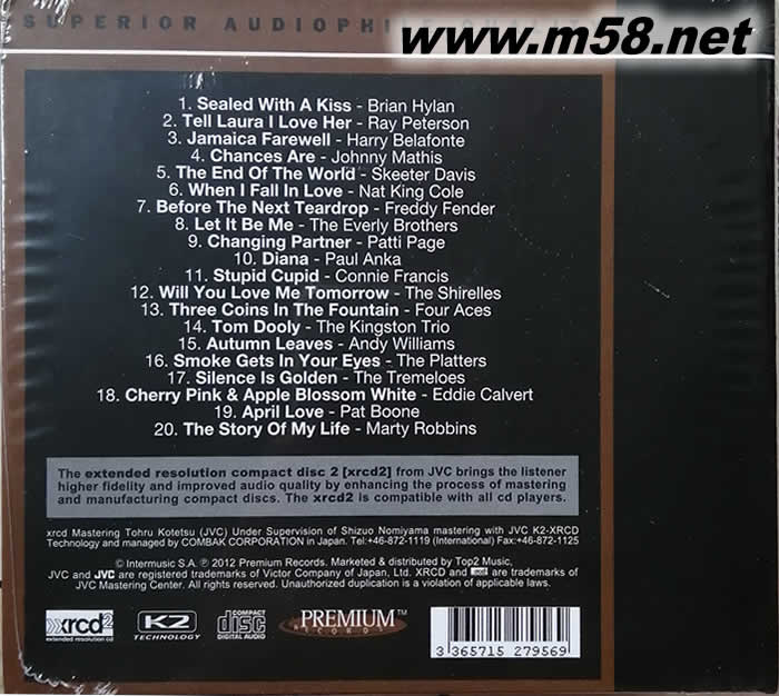 爵士紅伶 BEST AUDIOPHILE OLDIES XRCD(m58.net) 由JVC獨(dú)家開(kāi)發(fā)的XRCD,是經(jīng)由JVC研發(fā)的K2雷射定位錄音技術(shù),重新製作母帶。JVC獨(dú)家開(kāi)發(fā)的K2超級(jí)數(shù)字編碼器,可消除極大的低電頻信號(hào)的諧 波失真,減少系統(tǒng)運(yùn)行時(shí)不純淨(jìng)的交流電對(duì)數(shù)碼的雜波干擾,這樣技術(shù)使得原音得以忠實(shí)重現(xiàn)。XRCD全部按照16bit / 44.1KH2的CD標(biāo)準(zhǔn)製作,所以不需要特殊的CD唱盤(pán)或譯碼器就能明顯展現(xiàn)出與眾不同的優(yōu)越性。原裝母帶採(cǎi)用JVC超解析技術(shù)處理,日本製造。 原音原唱版。這張專(zhuān)輯由出版爵士女伶的新加坡唱片公司,再次和木內(nèi)和夫合作發(fā)行XRCD版原音原唱的西洋老歌。專(zhuān)輯收錄了世界知名巨星所唱的動(dòng)人懷舊歌曲,木內(nèi)先生的巧手,再次讓經(jīng)典老歌原音重現(xiàn),經(jīng)典無(wú)限。