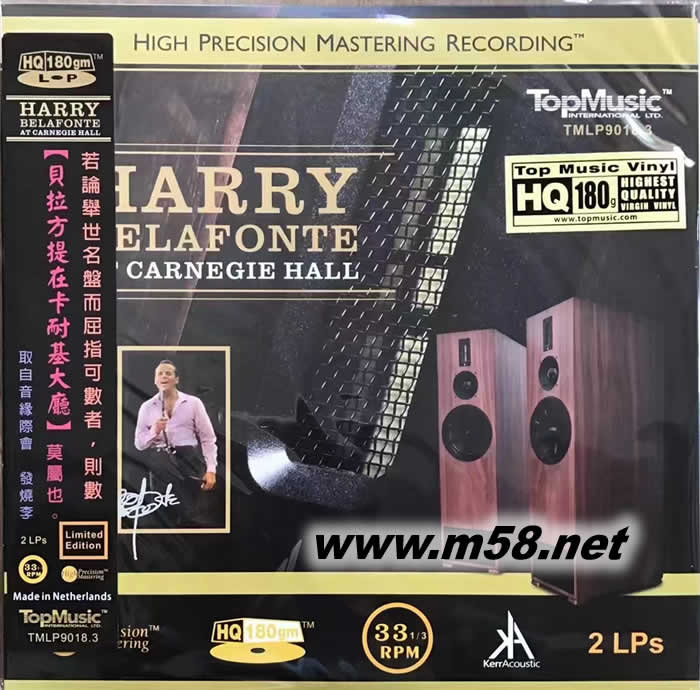 BELAFONTE AT CARNEGIE HALL 180g 33RPM LP 貝拉芬堤在卡耐基大廳 立體聲名盤 雙黑膠 天樂版(m58.net) 在上世紀五、六十年代開始,他是美國流行音樂史上與貓王齊名的偉大黑人歌手,是真正的黑人民族音樂發揚者,他以摻雜西印度群島加利帕騷(galypso)風格的演唱特色而傾倒眾生。與貓王的英年早逝相對比,BELAFONTE可說是株長青樹,他德高望重,健康長壽。熱心公益事業,本張專輯的絕靚現場演出,就是為做慈善。技佳,德美,傾倒眾生。幾十年來,一直是美國發燒界的模子。 他的嗓音中氣十足,嘹亮渾厚,肺活量大得驚人,嘖嘖,就憑這樣的底氣,不服不行。他既擅長古典,也擅長爵士,絕對發燒的一把好嗓!值得收藏!