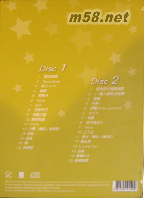 CD 1 01. 愛的習慣 02. Saranghae 03. 男人KTV 04. 情歌 05. 無限大 06. Kong 07. 好人 08. 我有今日 09. 美麗之最 10. 無言無語 11. Erica 12. 山歌 - 吳雨霏合唱 13. 走音 14. 信我 15. 運 16. 祝君好 CD 2 01. 原來你什麼都想要 02. (一個人唱的) 合唱歌 03. 遲鈍 04. 貝殼 05. 感動 (Live Version) 06. B.O.K 07. 命硬 08. 我不是好人 09. Volar 10. 三十日 11. 星火 - 唐素琪合唱 12. 情永落 13. Loving You 14. 自身 15. 兩個女人 16. 頭條新聞