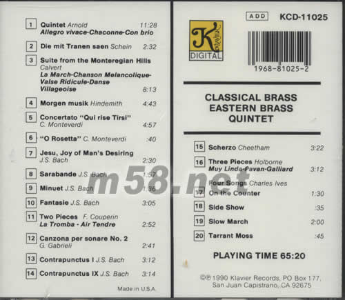 1.QUINTE ARNOLD ALLEGRO VIVACE-CHACONNE-CON BRIO 2.DIE MIT TRANNEN SAEN SCHEIN 3.SUITE FROM THE MONTEREGIAN HILLS CALVERT LA MARCH-CHANSON MELANCOLIQUE-VALSE RIDICULE-DANSE VILLAGEOISE 4.MORGEN MUSIK HINDEMITH 5.CONCERTATO QUI RISE TIRSI C.MONTEVERDI 6.O ROSETTA C.MONTEVERDI 7.JESU,JOY OF MAN'S DESIRING J.S.BACH 8.SARABANDE J.S.BACH 9.MINUET J.S.BACH 10.FANTASIE J.S.BACH 11.TWO PIECES F.COUPERIN LA TROMBA-AIR TENDRE 12.CANZONA PER SONARE NO.2 G.GABRIELI 13.CONTRAPUNCTUS I J.S.BACH 14.CONTRAPUNCTUS IC J.D.BACH 15.SCHERZO CHEETHAM 16.THREE PIECES HOIBORNE MUY LINDA-PAVAN-GALLIARD FOUR SONGS CHARLES IVES 17.ON THE COUNTER 18.SIDE SHOW 19.SIOW MARCH 20.TARRANT MOSS