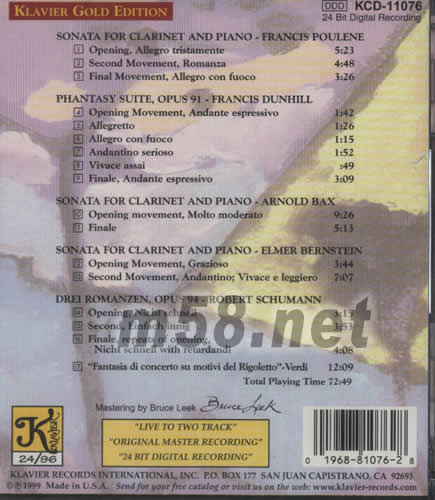 1.OPENING,ALLEGRO TRISTAMENTE 2.SEEOND MOVEMENT,ROMANZA 3.FINAL MOVEMENT,ALLEGRO CON FUOCO PHANTASY SUITE,OPUS 91-FRANCIS DUNHILL 4.OPENING MOVEMENT,AND ANDANTE ESPRESSIVO 5.ALLEGRETTO 6.ALLEGRO CON FUOCO 7.ANDANTINO SERIOSO 8.VIVACE ASSAI 9.FINALE,ANDANTE ESPRESSIVO SONATA FOR CLARINET AND PIANO-ARNOLD BAX 10.OPEVINH MOVEMENT,MOITO MODERATO 11.FINALE SONATAFOR CLARINET AND PIANO-ELMER BERNSTEIN 12.OPENING MOVEMENT,GRAZIOSO 13.SECOND MOVEMENT,ANDANTINO;VIVACE E LEGGIERO DREI ROMANZEN,OPUS94-ROBERT SCHUMANN 14.OPENING,NICHT SCHNELL 15.SECOND,EINFACH INNIG 16.FINALE,REPEATS OF OPENING NICHT SCHNELL WITH RETARDANDI 17.FANTASIA DI CONCERTO SU MOTIVI DEL RIGOLETTO VERDI TOTAL PLAYING TIME