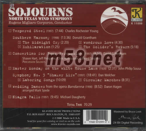 1.TEMPERED STEEL(1997) CHARLES ROCHESTER YOUNG SOUTHERN HARMONY(1998) DONALD GRANTHAM 2.THE MIDNIGHT CRY 3.WONDROUS LOVE 4.exhilaration 5.the solider's return 6.concertino for four percussion(1997) dvid gillingham shawn hart,jeff prosperie,chris rasmussen,edward stephen percussion soloists 7.easter monday on the white house lawn (1928) john philip sousa symphony no.3 shaker life (1997) danwelcher 8.laboring songs 9.circular marches 10.weddimg dances from the opera ban danna(1998) daron hagen arranged mark spede 11.niagra falls(1997) michael daugherty