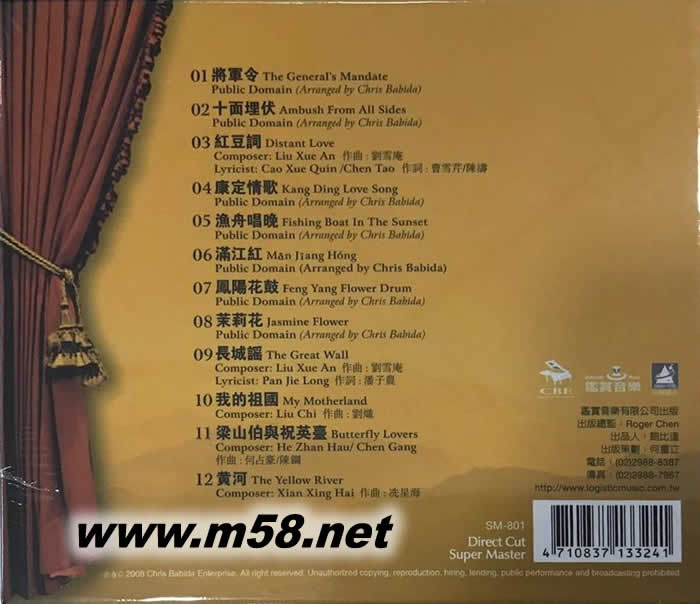 01. 將軍令 The General's Mandatc 02. 十面埋伏 Ambush From All Sides 03. 紅豆詞 Distant Love 04. 康定情歌 Kang Ding Love Song 05. 漁舟唱晚 Fishing Boat In The Sunset 06. 滿江紅 Man Jiang Hong 07. 鳳陽花鼓 Feng Yang Flower Drum 08. 茉莉花 Jasmine Flower 09. 長城謠 The Great Wall 10. 我的祖國 My Motherland 11. 梁山伯與祝英臺 Butterfly Lovers 12. 黃河 The Yellow River