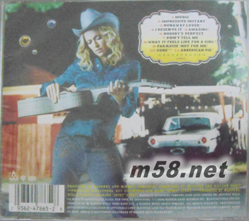 MUSIC音樂殿堂(m58.net) 全球27個國家發行首週的冠軍大碟 Madonna - 一個您永遠不會忘記的名字,當今娛樂界最有名氣的藝人,永遠走在流行時尚的尖端,永遠不知道她下一步會創造出什么讓人眼睛一亮的驚人之舉,不管在歌唱、演戲,甚至經營唱片公司,每個角色她都是最出色的!等待了2年半,繼上一張在全球狂賣且得獎無數的「Ray Of Light」專輯后,2000年的初秋,我們終於等到這張未上市已轟動全球樂壇的瑪丹娜「Music」。 無法捉摸的娜姐,這次邀集了許多Club音樂的重量級人物跨刀,包括了「Ray Of Light」專輯的幕后功臣William Orbit,此外,還有Mark "Spike" Stent、Guy Sigsworth、Talvin Singh及負責本張專輯大部份製作工作的法國電子DJ/製作人Mirwais。已在全球造成一股熱潮的首支單曲"Music",融合七O年代電子放克與電子音樂,已成為她第10首在英國金榜的冠軍曲,當然,也穩坐Billboard單曲榜冠軍寶座;聲音扭曲變形成機械式曲調的"Impressive Instant"也是首極具未來感的歌曲;和William Orbit合作的"Runaway Lover"宛如是一場熱鬧活潑的迷幻Party;聽完3首讓全身毛孔細胞徹底釋放的快節奏歌曲,加了Hip-Hop樂風,柔美旋律的"I Deserve It",頗能舒緩聽者的情緒;中版的電子放克作品"Nobody`s Perfect",娜姐則以呢喃輕柔的歌聲作了極夢幻的開場;由瑪丹娜與其妹婿Joe Henry所譜寫的"Don`t Tell Me",則是以空心吉他與鍵盤旋律架構出整首曲子,尤其是歌曲剛開始的巧妙間斷安排,別以為是跳針喔!"What It Feels Like For A Girl",豐富的旋律中闡述了女性在社會中扮演的角色;以空心吉他與電子樂元素所鋪陳出的"Gone",聽見娜姐感情豐富的流露。