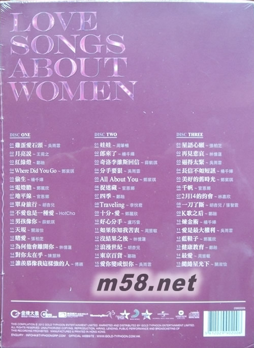 3CD收錄45首逾15位 真我女歌手打動芳心之作 CD 1 01. 雞蛋愛石頭 - 吳雨霏 02. 月亮說 - 王菀之 03. 紅綠燈 - 鄭融 04. Where Did You Go - 鄧紫琪 05. 偷生 - 楊千嬅 06. 電燈膽 - 鄧麗欣 07. 地平線 - 官恩娜 08. 單身旅行 - 胡杏兒 09. 不愛也是一種愛 - HotCha 10. 男孩像你 - 薛凱琪 11. 天規(guī) - 關(guān)淑怡 12. 賭愛 - 張柏芝 13. 為何他會離開你 - 林憶蓮 14. 對你太在乎 - 陳慧琳 15. 誰羨慕像我這樣強(qiáng)的人 - 傅穎 CD 2 01. 娃娃 - 周筆暢 02. 郎來了 - 楊千嬅 03. 奇洛李維斯回信 - 薛凱琪 04. 分手要狠 - 吳雨霏 05. All About You - 鄧紫琪 06. 捉迷藏 - 官恩娜 07. 四季 - 鄭融 08. Traveling - 李悅君 09. 十分.愛 - 鄧麗欣 10. 好心分手 - 盧巧音 11. 如果你知我苦衷 - 周慧敏 12. 沒結(jié)果之后 - 林憶蓮 13. 浪漫世紀(jì) - 胡杏兒 14. 東京百貨 - 鄭融 15. 愛你變成恨你 - 吳雨霏 CD 3 01. 星語心愿 - 張柏芝 02. 再見悲哀 - 林憶蓮 03. 逼得太緊 - 吳雨霏 04. 長信不如短訊 - 楊千嬅 05. 美好的舊時光 - 鄧紫琪 06. 千帆 - 官恩娜 07. 2月14的約會 - 林嘉欣 08. 一刀了斷 - 胡杏兒/張智霖 09. K 歌之后 - 鄭融 10. 煉金術(shù) - 楊千嬅 11. 愛是最大權(quán)利 - 吳雨霏 12. 藍(lán)鞋子 - 鄧麗欣 13. 健康教育 - 鄭融 14. 最愛 - 周慧敏 15. 繾綣星光下 - 關(guān)淑怡