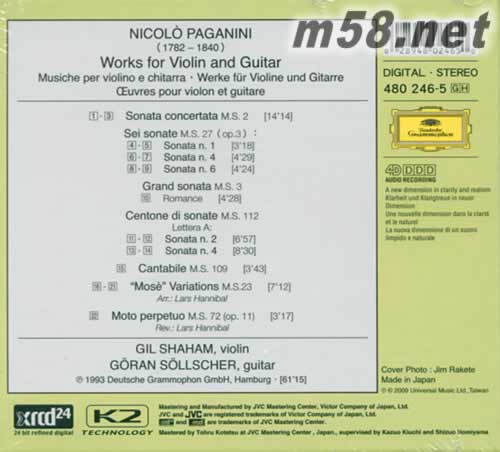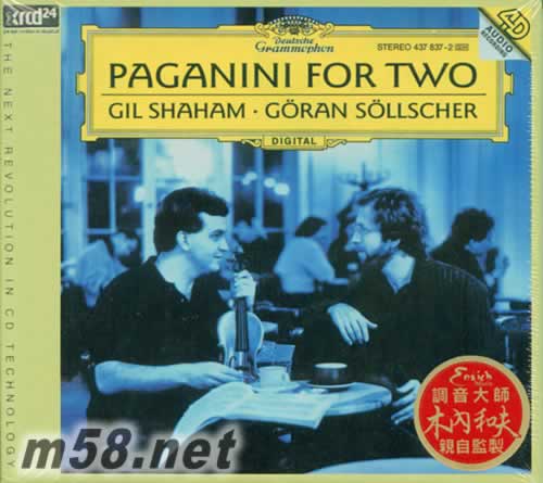 PAGANINI FOR TWO WORK FOR VIOLIN AND GUITAR 帕格尼尼 小提琴與吉它合奏XRCD(m58.net) 古典吉他運指的跳和小提琴甜美相呼應著您的系統流暢一聽就知道。提琴的松香味加上吉他尼龍弦的溫暖中頻,缺一不可。讓您有置身于大海的邊緣,清新的海風迎面吹來的感覺