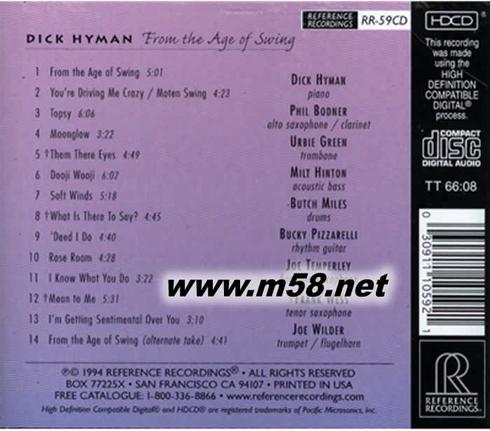 01 - Dick Hyman - From the Age of Swing 02 - Dick Hyman - You're Driving Me Crazy , Moten Swing 03 - Dick Hyman - Topsy 04 - Dick Hyman - Moonglow 05 - Dick Hyman - Them There Eyes 06 - Dick Hyman - Dooji Wooji 07 - Dick Hyman - Soft Winds 08 - Dick Hyman - What Is There to Say 09 - Dick Hyman - 'Deed I Do 10 - Dick Hyman - Rose Room 11 - Dick Hyman - I Know What You Do 12 - Dick Hyman - Mean to Me 13 - Dick Hyman - I'm Getting Sentimental Over You 14 - Dick Hyman - From the Age of Swing (alternate take)