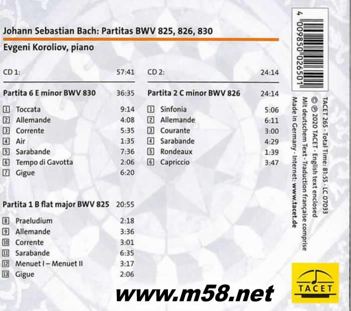 柯洛里奧弗 巴哈鋼琴組曲Johann Sebastian Bach : Partitas Part 1 ; BWV 825, 826, 830(m58.net) 鋼琴大師柯洛里奧弗(Evgeni Koroliov)在最新作品收集了布拉姆斯的所有間奏曲,極度忠於樂譜,細膩、精確、清晰的演奏方式,驚人的細節永無止境,踏板的劑量,音平面的平衡,節奏的寧靜,注意沉默;樂器的絲般柔和的聲音也使人著迷,您會驚嘆於布拉姆斯在這里展現出的各種形態和聲音。 CD錄音地點在柏林的耶穌基督教堂,透過TACET高品質錄音,透明乾凈而且音色晶瑩,成為一張可以一次又一次聆聽的完美作品。