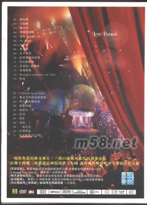 愛的大游行DVD(m58.net) 當代華語樂壇最佳女歌手梁靜茹人生第一場個人演唱會,我們與梁靜茹只有一次的第一現場[愛的大游行] 2DVD精彩重現27首感動全場的視聽美麗時光 靜茹在2004年10月在臺北臺大體育館舉行的一連兩場《愛的大游行》,貝殼型舞臺、情人沙發座再加上超廣音域的東方叁弦琴等聲勢浩大的樂隊,靜茹的動人情歌與在場4,500名觀眾一起唱和,讓歌迷度過一個愛的晚上。 梁靜茹以一身白鳳蝶晚禮服、頭頂著80公分高的白羽毛帽空降,以五月天為她打造的搖滾快歌「燕尾蝶」出場,接著身體舞動的「不想睡」、「I should be so lucky」也驚動全場。 除了梁靜茹擅長的抒情曲風、還有搖滾曲風、ACCAPELLA曲風,讓她唱得暢快淋漓,一展她的歌喉。安可曲「分手快樂」是全場另一波大合唱高潮。由小歌女化身為天后過程的「掌聲響起」,更讓梁靜茹終于忍不住落淚,為這次熱鬧的「愛的大游行」演唱會劃下一個圓滿的句號。