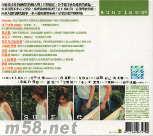 SUNRISE,我喜歡(m58.net) 在這張「Sunrise,我喜歡」專輯里,靜茹再度與馬毓芬、郭文賢、蔡尚文等制作人合作,也再度演唱到了如蔡健雅、潘協(xié)慶、李焯雄與葛大為等曾經(jīng)合作過(guò)的詞曲作者的創(chuàng)作,靜茹更邀請(qǐng)來(lái)好友汪佩蓉在專輯中創(chuàng)作、制作。制作過(guò)程中與這些音樂(lè)人完美的默契在這張專輯里表露無(wú)遺,而靜茹也參與了更多自己的想法與意見(jiàn),靜茹覺(jué)得跟這些音樂(lè)人合作真的是一種享受,因?yàn)橐呀?jīng)擁有很好的默契,在溝通的時(shí)候總能激蕩出更多的火花。我們可以發(fā)現(xiàn)靜茹歌聲的穿透力更強(qiáng)了,那股感動(dòng)我們的力量,也變得更加深刻。這張專輯的曲風(fēng)相當(dāng)豐富,除了延續(xù)「梁靜茹式」的甜美幸福情歌之外,也全新嘗試了一些如JAZZ風(fēng)味與民謠氛圍的歌曲。第一首推薦歌曲「分手快樂(lè)」,是獻(xiàn)給失戀朋友溫暖祝福的一首歌,鼓勵(lì)大家繼續(xù)在愛(ài)情里找尋幸福與祝福,要相信愛(ài)情永遠(yuǎn)是美好的,這首歌由「最想環(huán)游的世界」原班人馬姚若龍作詞,郭文賢創(chuàng)作、制作。另外,專輯中也邀請(qǐng)了好友汪佩蓉,為靜茹創(chuàng)作了兩首感人新曲「Sunrise」與「小小的愛(ài)情」,可以從靜茹的細(xì)膩歌聲中聽(tīng)見(jiàn)佩蓉與靜茹合作時(shí)的默契。而在專輯中也特別收錄了一首靜茹和男友阿管的定情之歌「喜悅」,并由靜茹與阿管共同制作,作為送給大家情人節(jié)的最佳獻(xiàn)禮 特別推薦《吐司男之吻2》、[分手快樂(lè)]、《搖滾莎士》片尾曲、[我喜歡]