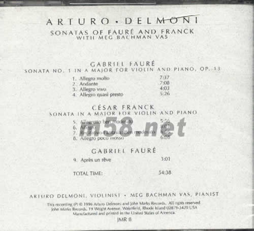 ARTURO.DELMONI SONATAS OF FAURE AND FRANCK WITH MEG BACHMAN VAS GABRIEL FAURE SONATA NO.1 IN A MAJOR FOR VIOLIN AND PIANO,OP.13 01. Allegro molto 02. Andante 03. Allegro vivo 04. Allegro quasi presto CESAR FRANCK SONATA IN A MAJOR FOR VIOLIN AND PIANO 05. Allegretto ben moderato 06. Allegro 07. Recitativo-Fantasia:Ben moderato 08. Allegro poco mosso GABRIEL FAURE 09. Apres un reve TOTAL TIME:54:38