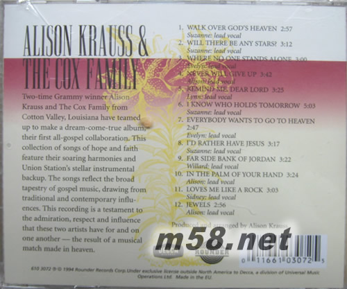 THE COX FAMILYI Know Who Holds Tomorrow(m58.net) 多次被評為世界最美的女聲 坐擁11座格萊美獎。 最著名的歌曲When you say nothing at all(永遠有多遠) 被無數人當作心中永恒的經典。 冷山中那首動人的The Scarlet Tide的演唱者.獲得2004年奧斯卡最佳電影歌曲提名。 在和聯合車站樂隊的合作后,Union Station的Bluegrass威力又像是幫她往前推了一把,讓已經擁有翅膀的Alison又添加一道光環。 當一位鄉村電臺DJ某天在節目中播放Alison精選專輯主打歌「When You Say Nothing At All」后,每天如浪潮般的點歌頻率,開啟了鄉村音樂的一個新傳奇。Alison在1995年與Union Station合作的精選大碟,曾是鄉村音樂排行榜第2名、流行音樂專輯第15名,全美銷量達二百萬張,這對于一個鄉村歌手而言,是相當大的數目。不過與其說專輯得到如此多的成功是個意外,不如承認Alison無可否認十分甜美的歌喉,及用心演唱的態度,才是讓她長久以來受歌迷肯定的主要原因。 16歲時,Alison Krauss(艾莉森.克羅絲)與美國鄉村音樂最重要的獨立唱片公司Rounder簽約,發行的第一張個人專輯,立刻成為樂評家的最愛。18歲首度獲得葛萊美獎,之后又繼續獲得無數鄉村音樂獎項,其中包括11項葛萊美獎,總總的榮耀應該都是因為她從小苦學古典小提琴、民謠小提琴及歌唱技巧。 作為電影「新娘百分百」主題曲「When You Say Nothing At All」原唱者,與羅南詮釋方式不同,Alison溫柔舒服的唱腔,搭配著吉他和鋼琴伴奏,簡單又令人感動不已;樂評家均認為AKUS(Alison Krauss and Union Station)從80年代末至90年代中,將草根藍調音樂從地方性音樂帶領成為全世界均能接受的樂風,在樂壇占有舉足輕重的地位。 1999年,Alison Krauss的專輯《Forget About It》成為金唱片。一年后,她因在《O Brother ,Where Art You》電影原聲專輯中的出色表現而再度引起人們關注,她也因此而成為自Bill Monroe之后,又一位從肯塔基西部群山中突現的藍草歌手。不論在藍草音樂領域還是鄉村主流音樂領域,Alison Krauss和她的樂隊Union Station在過去一年中的出色表現都是不容忽視的。除了在原聲專輯中的合作,他們還同Kenny Rogers等老鄉村歌手和傳統藍草音樂歌手錄制作品。 Alison Krauss 是當今美國藍草音樂的領軍者,“藍草音樂”(Blue Grass)是美國民間音樂的一種,從上世紀二十年代出現并開始發展,在新世紀里未顯絲毫頹敗之勢,因Alison 這樣優秀蘭草歌手的不斷革新,使蘭草音樂煥發出更為迷人的氣質,作品逐漸擠占主流唱片市場份額,且在全球都擁有越來越多的歌迷。 Alison的歌曲之所以吸引人是因其個人演唱魅力和她所創作的精致、純正的蘭草音樂。Alison的歌曲中使用的樂器依然是小提琴、曼陀鈴、木吉他和斑鳩琴這樣蘭草的標準樂器,編曲配器也絕少矯飾,沒有任何世俗渲染的音樂配上Alison Krauss清泉般透徹的歌聲,使得蘭草音樂愈加發揚光大。 聽Alison Krauss唱歌,恍如清晨站在草原上,輕風拂在臉上,和煦的陽光照在身上,抬起頭,看藍天上白云悠然而過…… 《Let Me Touch You For A while》、等曲子反復聽幾十遍,還是覺得時間過得太快。孤獨,而且最好有點寂寞的時候適合欣賞Alison Krauss,無論內心還是環境,都異常安靜Alison Krauss 單薄而清亮的歌聲,時而歡喜昂揚,時而抑郁低吟,很簡單的音樂,很平實地唱著生活中的點點滴滴。這是一種不慍不火,溫暖卻憂郁,柔美又堅強的感動,一種舒服得令人想掉淚的感動。