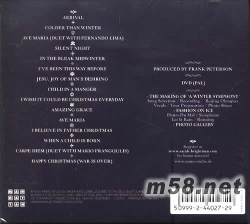 CD 1. Arrival (ABBA) 2. Colder Than Winter (Vince Gill) 3. Ave Maria (Duet with Fernando Lima) 4. Silent Night 5. In The Bleak Midwinter 6. I’ve Been This Way Before 7. Jesu, Joy of Man’s Desiring 8. Child in a Manger 9. I Wish It Could Be Christmas Everyday 10. Amazing Grace 11. Ave Maria 12. I Believe In Father Christmas (ELP) 13. When A Child Is Born 14. Carpe Diem (Duet with Mario Frangoulis) 15. Happy Christmas (War is over) (Lennon) DVD (approx. 30 minutes) 1. Fleurs du Mal (from Atlantic City Live) 2. Symphony (from Atlantic City Live) 3. Let It Rain (from Atlantic City Live) 4. Running (from Atlantic City Live) 5. A 3 min trailer with highlights from Symphony Live 6. Making of “A Winter Symphony” : Vocal session 7. Making of “A Winter Symphony”:Orchestra session 8. Making of “A Winter Symphony”:Band session 9. Making of “A Winter Symphony”:Vocal coaching 10. Making of “A Winter Symphony”:Workout with Sarah’s personal trainer 11. Making of “A Winter Symphony”:Photosession 12. Making of “A Winter Symphony”:Tour production meeting 13. Photo gallery : Outtakes from the photosession