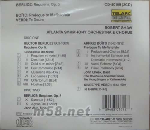 柏遼茲 安魂曲(m58.net) 氣勢懾人的合唱聲響 以《幻想交響曲》被愛樂者所熟知的浪漫派標題音樂大師白遼士,《安魂曲》是其另一重要之代表作,作曲家使用了大樂團及大合唱團的編制,營造出歌曲所蘊含的肅穆崇敬之氣氛,《末日經》中聲勢懾人之銅管音響,令人不免對死亡寒顫不已。十九世紀末的義大利作曲家兼劇作家包伊多,曾為威爾第寫過《奧泰羅》及《法斯塔夫》之劇本,懾人的合唱與樂團的默契皆為十分完美之組合。歌劇《梅菲斯多菲》是包伊多人聲樂曲之代表,風格近似威爾第,為典型的義大利式歌劇。羅伯‧蕭以詮釋合唱曲之功力被譽為當今合唱音樂界之泰斗,名曲輔以發燒級人聲錄音之名碟,愛樂者不容錯過!榮獲TAS、葛萊美獎及三星帶花名盤。