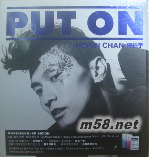 PUT ON(m58.net) 第5張 全新個人專輯 CD+DVD收錄11首全新歌曲 + 3首MV + 陳柏宇x馮曦妤 Mini Live 香港電臺熱播 激勵主打 【別怕失去】 [瞞你瞞我]第二樂章 【多此一愛】 挑戰日本歌皇平井堅[戀上你]【再見不再見】陳柏宇首支創作【沒有吻的資格】 2010年陳柏宇推出他的第五張專輯【Put On】!希望從這張唱片可以讓大家看到陳柏宇經過五年洗禮后,聽到的是Jason在音樂上的成熟演繹。 全新專輯【Put On】收錄11首全新作品加3首新歌MV,更特別附送《Sony Ericsson Presents: 陳柏宇x 馮曦妤 Mini Live》!在樂壇耕耘了五年的Jason, 不知不覺已推出他的第五張專輯,由懵懂的傻氣大男孩蛻變成對音樂有想法的實力歌手,這五年間,我們都可以看到Jason對音樂的付出和努力! 首支主打「別怕失去」,由C.Y.Kong/ Davy Chan作曲及監製,老拍檔黃凱琪填詞,表面上是勸勉人要忘記舊愛,實質是一首勵志歌曲,寄語人要放下過去,無需要眷戀痛苦的回憶,否則只會「逆向分針往后退」! 製作班底猶如參加音樂盛宴 【PUT ON】當然不乏一貫與Jason合作無間的音樂人包括陳光榮、林夕、C.Y.Kong、Davy Chan、黃凱琪等。陳光榮與林夕這個黃金組合更為Jason寫下繼「你瞞我瞞」后的第二樂章「多此一愛」 自我挑戰: 陳柏宇作品 「沒有吻的資格」在這張專輯中,Jason終於揭曉他與好友謝浩文創作的全新作品「沒有吻的資格」! 特別送上: 〈Sony Ericsson Presents: 陳柏宇x 馮曦妤 Mini Live〉 兩位師兄妹首次合作,Jason當然不放過重新演譯Fiona Fung作品的機會!Jason就選了Fiona的出道作「陽光‧雨」,而小師妹則選了師兄的「逸后」重唱。
