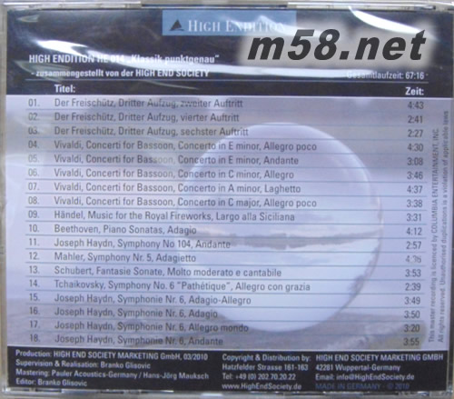 測(cè)試14 HIGH END EDITION VOLUME 14 玻璃球 CLASSIC PIN POINTED(m58.net) 皇牌精選,發(fā)燒友不會(huì)錯(cuò)過的德國高級(jí)音響協(xié)會(huì)示范天碟,第十四集名為Classic Pin Pointed (玻璃球),專集以一個(gè)玻璃球反映出對(duì)岸的美景,全碟67分鐘,由15首精彩古典音樂和三首歌唱組成。2010年為Denon, Nippon Columbia 100週年紀(jì)念,為慶祝這重要日子,德國高級(jí)音響協(xié)會(huì)搜羅Denon, Nippon Columbia公司在90年代出色單點(diǎn)收音作品,這些錄音正示范出何為單點(diǎn)錄音,帶來原音 (acoustic) 樂感。 一如過往,本專輯以更勝原版音效為主,所有CD製作均以國際Red Book Specifications標(biāo)準(zhǔn)為規(guī)格,例如 (less than 120 BLER - Block Error Rate ) 等,更由德國老虎魚工作室(Pauler Acoustics)為本專輯作后期混音工作,限量金碟版,音效出眾,信心保證,更是2010年德國高級(jí)音響協(xié)會(huì)展覽會(huì)試機(jī)專用碟。