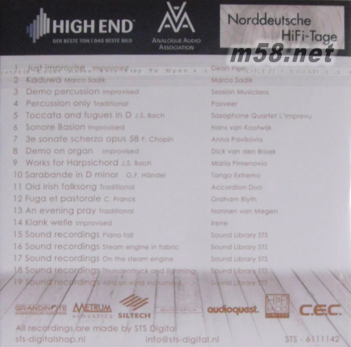 馬蘭士-慕尼黑2016音響展超級測試片 THE ABSOLUTE SOUND REFERENCE VOL 1 第一集(m58.net) 馬蘭士-慕尼黑2016音響展超級測試片 3款CD:第一。二。三集--- 在一般消費(fèi)者眼里,「發(fā)燒專輯」也許是一些前輩或過氣歌手重唱?jiǎng)e人的歌,然后在錄音上加料而成的專輯。在音樂圈之中,發(fā)燒專輯有很多種類,而這兩張2016慕尼黑音響展超級測試片1、2集的誕生,是發(fā)燒專輯的奇蹟。 STS DIGITAL是荷蘭的頂級發(fā)燒唱片公司,因何會與歐洲頂級發(fā)燒硬體商連結(jié)在一起?簡單說明就是『冠名贊助』。 以發(fā)燒品牌冠名的STS專輯,在製作上會盡用贊助商的頂級線材或其他產(chǎn)品,而製作流程上,均會用最頂級Hi-End線材,目的是為了顯示其發(fā)燒專輯之威力。不過,專輯可以發(fā)燒到傳真、傳神,關(guān)鍵之處還是幕后錄音工程師,這位可以號稱神人之耳、發(fā)燒之手的荷蘭頂尖工程師FRITZDE WITH。 這兩張發(fā)燒專輯之製作,是一家荷蘭的錄音工作室STS DIGITAL負(fù)責(zé),此機(jī)構(gòu)曾經(jīng)為日本MARANTZ【馬蘭士】連續(xù)十多年製作冠名DEMO CD,而且贏得不少口碑,讓聲音如此傳真的靈魂就是工程師FRITZDE WITH。這兩張超級測試片,其內(nèi)容多是精選不同類型的經(jīng)典錄音,這對后期調(diào)聲工作,自然增加了很大難度,而經(jīng)過工程師FRITZDE WITH的巧手混音,這些源至不同年代的音樂訊源,不但均衡有道,更比原版更傳神和悅耳,原本舊類比音源相較之?dāng)?shù)位、聲音寬廣、輕柔、不尖銳,一般類比轉(zhuǎn)數(shù)位之后發(fā)行CD,聲音一向比原黑膠音場窄、較尖銳、中低音也比較差,而這兩張超級測試片,已經(jīng)改變了很難以突破的那個(gè)關(guān)鍵點(diǎn),讓發(fā)燒友在聆聽的過程中,也大為讚嘆的神奇之音,如果你的收藏中還少了什么樣內(nèi)容的音樂專輯,那將是你最好的選擇。