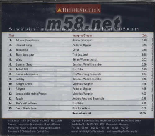 測試 8 北國風情SCANDINAVIAN TUNE VOLUME 8(m58.net) High End Society[德國高級音響協會]2005至06年度最新推出,挑選 Opus 3之15首作品,當中古曲、爵士、藍調、歌唱等原版本在發燒音圈一早已獲得錄音上幾乎沒有人說不好之稱贊。后交與近年被力捧之Pauler Acousties<老虎魚>制作室作Mastering。新版本在[真實自然,純凈無染]感表現得十分優秀,演奏及演唱者的功力更無容置疑,絕無冷場。給聆聽者沉溺于浪漫情調。