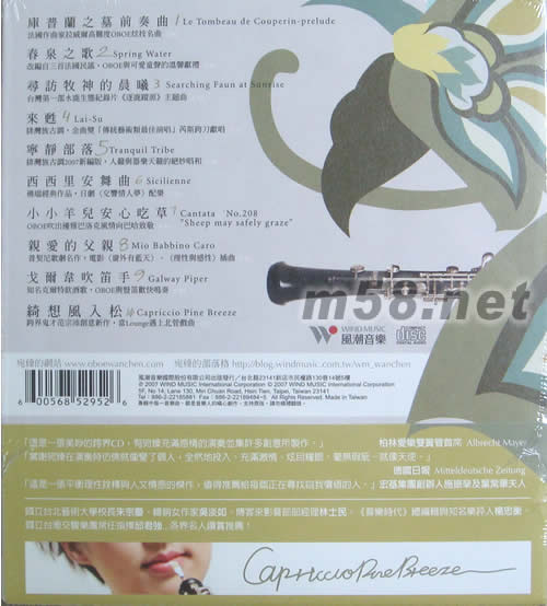 越界嬉游-謝宛臻OBOE跨界演奏專輯(m58.net) 當謝宛臻在演奏時仿佛就像變了個人,全然地投入、充滿激情、炫目耀眼、毫無瑕疵 ~ 就像天使。」德國報紙曾如此形容這位第七屆韓德爾雙簧管國際大賽現代組首獎得主,曾也是首位在國際比賽中獲此殊榮的臺灣雙簧管演奏家。師事雙簧管名家Burkhard Glaetzner的宛臻,曾隨前柏林愛樂雙簧管首席Lothar Koch與現任柏林愛樂首席Albrecht Mayer習藝,2000年取得Diplom學位畢業於柏林藝術大學,2006年更完成柏林藝術大學雙簧管「國家最高演奏文憑(Konzertexamen)」學位。 留學期間,宛臻有豐富的歐洲巡演經驗,并曾在前德國總統Rau座前演出。曾有德國樂迷形容:「若閉上眼睛欣賞她的演出,絕對不會猜到她是亞洲人,她的巴洛克音樂語言是如此的流暢自然。」。 近年來,宛臻在臺灣各地的演出也非常活躍,首演德、法、日、韓等國當代知名作曲家之作品,獲得極大迴響,并二度獲選為中正文化中心「樂壇新秀」,與國家交響樂團(NSO)合作演出;2006年亦受邀與臺北愛樂青年管弦樂團合作,首度與指揮家夫婿邱君強同臺演出。謝宛臻目前任教於交通大學音樂研究所、關渡臺北藝術大學音樂系及師大附中音樂班。