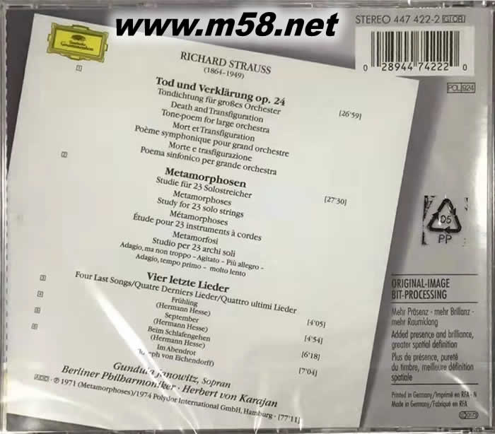 卡拉揚(yáng)指揮 施特勞斯:最后四首歌 Richard Strauss:Vier letzte Lieder(m58.net) 由女高音昆杜拉?雅諾維茨主唱,赫伯特?馮?卡拉揚(yáng)指揮柏林愛(ài)樂(lè)樂(lè)團(tuán)演奏灌錄的《理查德?施特勞斯:最后四首歌》,2009年的《企鵝古典唱片指南》中推薦為三星。 黑塞的詩(shī)作被改編成的藝術(shù)歌曲,最著名的可能就是施特勞斯的《最后四首歌》。 理查德?施特勞斯的創(chuàng)作生涯自藝術(shù)歌曲始,也至藝術(shù)歌曲終。6歲時(shí),施特勞斯寫出了第一首圣誕歌曲,到1948年,即他逝世的前一年,理查德?施特勞斯又以著名的《最后四首歌》作為他的終筆之作。 施特勞斯一生鐘情于藝術(shù)歌曲的創(chuàng)作,總共寫出了由樂(lè)隊(duì)或鋼琴伴奏的歌曲200多首。究其原因,大概一方面是出于他對(duì)人聲,特寫是女高音與大型樂(lè)隊(duì)相配合的喜愛(ài),另一方面或許因?yàn)樗姆蛉司褪且晃桓璩业木壒省K乃囆g(shù)歌曲保有了他在歌劇和一些器樂(lè)作品創(chuàng)作中的特點(diǎn),能非常和諧地把高雅情調(diào)與瓦格納式的豐富多彩結(jié)合在一起,通過(guò)旋律賦予歌詞以生命,從而盡顯莊嚴(yán)、平和之色。 理查?施特勞斯的《最后四首歌》,創(chuàng)作于作曲家與夫人移居瑞士期間,二戰(zhàn)結(jié)束后,理查?施特勞斯由于與納粹的密切關(guān)系而離開德國(guó),也許是由于對(duì)漂泊生活的失望,他根據(jù)艾興多夫的詩(shī)句寫成歌曲《黃昏》,歌中明確表達(dá)出了告別幸福生活之感,管弦配樂(lè)也引用了早期交響詩(shī)《死亡與凈化》中的旋律,聽(tīng)來(lái)令人非常動(dòng)情。隨后,一本新出版的赫爾曼?黑塞詩(shī)集激起了作曲家的創(chuàng)作欲望,他為其中三首詩(shī)譜曲寫成《春天》、《九月》和《入睡》,就此完成了自己一生的創(chuàng)作。由女高音與樂(lè)隊(duì)配合演唱的《最后四首歌》既是施特勞斯畢生辛勤勞動(dòng)的一個(gè)光輝而動(dòng)人的總結(jié),也是后期浪漫派在音樂(lè)藝術(shù)風(fēng)格上的完美體現(xiàn)。 德國(guó)女高音歌唱家昆杜拉?雅諾維茨(Gundula Janowitz),從來(lái)都不缺乏聽(tīng)眾,因?yàn)樗穆曇魲l件實(shí)在是太出眾了。她的嗓音純凈的有點(diǎn)不食人間煙火,并且音色有一種他人難以比擬的銀質(zhì)般光芒,而演唱時(shí)也始終能保持均衡的儀態(tài),長(zhǎng)句線條的控制尤為出色。 這套由女高音昆杜拉?雅諾維茨主唱,赫伯特?馮?卡拉揚(yáng)指揮柏林愛(ài)樂(lè)樂(lè)團(tuán)演奏錄制的《理查?施特勞斯:最后四首歌》,是備受好評(píng)的杰出錄音版本。