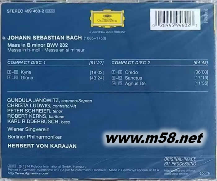 巴哈:B小調彌撒 MASS IN B MINOR (DG雙碟)(m58.net) 《B小調彌撒》是巴哈為在萊比錫舉行的慶祝選帝侯奧古斯特二世繼位時所譜寫的作品。巴哈在作品完成后把它題獻給德勒斯登宮廷,也因為這部作品得到「選帝侯薩克森宮廷樂團的宮廷作曲家」的稱號。這首作品最優異的地方在於每一首樂曲都有豐富多變的風格,展現巴哈六十多年來對於創作人聲與管弦樂的心得與精華,可謂集巴哈多年來創作技巧之大成。由於巴哈是虔誠的路教派教徒,他所創作的宗教音樂自然是符合路德教會所需,即摒去羅馬天主教復雜且龐大的格式,而是由簡單的四大部構成。 這是卡拉揚在七○年代的錄音,他讓整部作品極富張力並洋溢著宗教性的感染力,是相當具有結構性美感的詮釋。