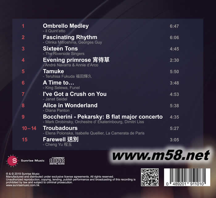 Ombrello Medley - il Quint’etto Fascinating Rhythm - Olinka Mitroshina, Georges Guy Sixteen Tons - The Riverside Singers Evening primrose宵待草 - André Navarra & Annie d’Arco Tamuke - Teruhisa Fukuda 福田輝久 A Time to… - King Selewa, Funel I've Got a Crush on You - Janet Seidel Alice in Wonderland - Diana Panton Boccherini - Pekarsky: B flat major concerto - Mark Drobinsky, Orchestre d' Ekaterinbourg, Dimitri Liss Troubadours – Elena Polonska, Isabelle Quellier, La Camerata de Paris Farewell 送別 - Cheng Yu程玉