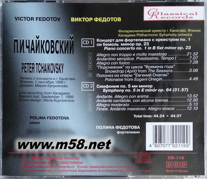 Tchaikovsky: Symphony No.5/ Piano Concerto No.1 柴可夫斯基: 第1號鋼琴協奏曲(Polina Fedotova鋼琴) 雙CD(m58.net) 柴可夫斯基: 第1號鋼琴協奏曲(Polina Fedotova鋼琴)/ 第5號交響曲/ 季節(四月)/ 波蘭舞曲( 選自歌劇「尤金‧奧涅金」) 費多托夫(Victor Fedotov,1933~2001) 指揮 日本Kanagawa愛樂管弦樂團 1991年父女同臺音樂會精彩紀實,默契絕佳 俄羅斯原裝進口, 原始母帶精心轉製