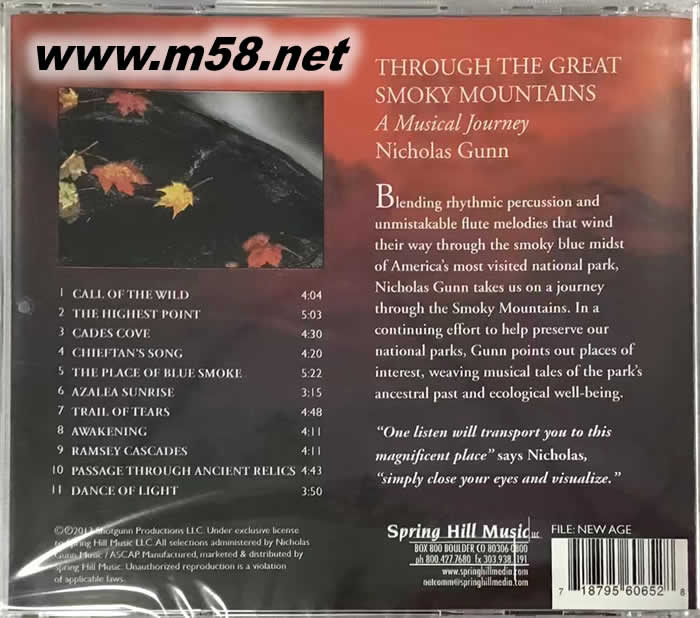 煙山之旅 THE GREAT SMOKY MOUNTAINS(m58.net) 煙山之旅 劃開藍色迷霧天際 震攝影鼓聲狂擊腔膛 曾盤據美國BILLBOARD新世界榜32周紀錄的大峽谷長笛圣手-NICHOLAS GUNN居尼古拉斯·金,全新大煙山國家公園音樂大碟,以音樂展現自然之美的功力再創顛峰。長笛的織柔與鼓剛陽,NICHOLAS 神處其技地將兩者做了最令人邀賞的組合,向上攀升的笛聲被震攝的鼓聲誘發出織柔之外的堅韌,結它點綴的修飾亦異常優美。隨著NICHOLAS的音樂,美國大煙山國家公園的美有如親自看見。