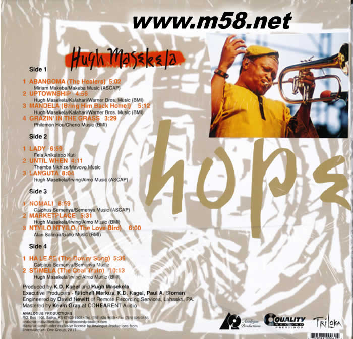 馬塞凱拉 - 希望 HOPE 希望 180g 45RPM LP 黑膠(m58.net) 《希望》(Hope)將向您展示最優秀的音響效果。修?馬塞凱拉(Hugh Masekela),一位南非優秀的小號手,在華盛頓現場錄制了這張一流的碟片。專輯收錄的歌曲,跨越了時間的界限,近五十的歌曲在其中都有體現,從另一個側面也帶領人們去認識修?馬塞凱拉(Hugh Masekela)的人生。 Hugh Masekela的歌聲帶著濃厚的黑人情愫,他吹奏的小喇叭除了極佳的技巧操控, 對于情感的描繪也是一流的!