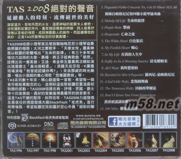 TAS 絕對的聲音SACD 2008 鬼斧神功(m58.net) 挑戰(zhàn)最挑剔的耳朵 延續(xù)動人的時刻.流傳絕世的美好 凝望遠方、若有所思的少女,溫柔神秘的氣質(zhì)令人眷戀。沒有攝影紀實的年代,畫家捕捉傳真的神韻,詩人借景抒發(fā)無以言喻的情思,成就無數(shù)動人的創(chuàng)作。而延續(xù)傳世的美好,正是TAS所要帶給您的珍貴獻禮。 TAS2008收錄小提琴家瓜塔挑戰(zhàn)帕格尼尼小提琴協(xié)奏曲原譜的極限;大河之舞歌手、「天使女伶」樂團員琳恩以輕靈的歌聲唱出「生命的旋律」;有三十多年演唱功力加持的大衛(wèi)‧慕楊,將王子經(jīng)典歌曲「紫雨」詮釋出另一番風(fēng)貌;艾迪.希金斯五重奏再次精彩演出搖擺爵士「晨光般輕柔」;民謠天后莎拉‧K廣播現(xiàn)場演唱「我曾經(jīng)認識你嗎?」;來自挪威的時光樂團,唱出小酒館的傷心情歌「悲傷圓舞曲」等。 TAS系列數(shù)十年來,嚴苛的篩選每一首歌,希望每一個音符都能夠牽動您的心,并期盼這些歌能讓您重溫最初聆聽的感動。TAS2008 收錄古典、抒情、民謠、爵士等十四首樂曲。最好的音樂值得最嚴苛的錄音要求,這是TAS不變的堅持,如同往年,TAS2008力邀發(fā)燒友最信任的德國發(fā)燒大廠Stockfisch「老虎魚」進行母帶后製,希望能讓您找到屬于您心中最「絕對的聲音」!