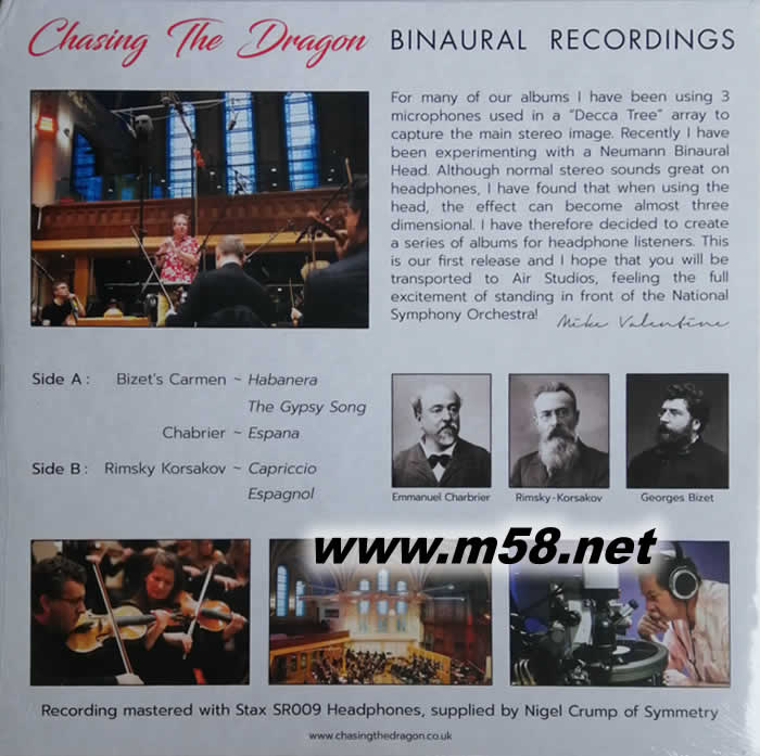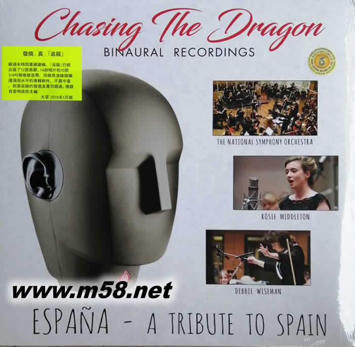 耳聽為真 第一集 追龍 Chasing The Dragon –ESPANA Binaural Recordings 180g 黑膠(m58.net) Chasing The Dragon追龍第一、第二集,是在英國圣馬田教堂(St. Martin in the Fields)錄音,地利。發燒咪動用了由著名收音咪品牌Neumann公司出品Binaural Head錄音方式,同步收錄當時的音訊,這入耳式錄音方式(又名人頭錄音),是將兩只靈敏度高的Neumann收音咪收藏在一個模擬人頭的耳窩里,目的是反映現場耳朵所接收的聲音及一切之聲效,這是最真實的聲音效果,器利。如此一來,即時可獲得如在現場收聽一樣的感受,真實得可怕。 莫札特長笛與豎琴協奏曲,愛爾蘭豎琴家Jean Kelly及長笛名家Fiona Kelly合作演出,兩姊妹合作天衣無繨,整座教堂美麗音效立體呈現,左手邊是小提琴手,右手邊是低音琴手伴奏,那樣真實的感覺,就好像返回1760年!莫扎特活了!
