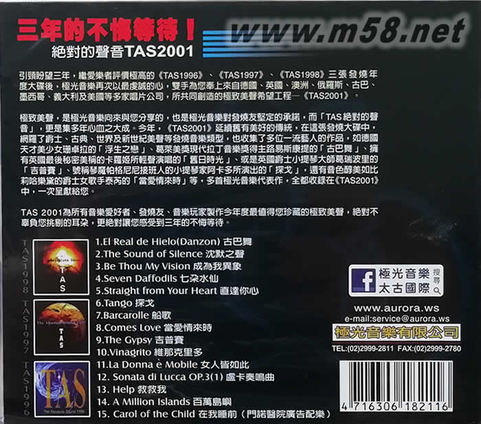 TAS 絕對的聲音CD 2001(m58.net) 請點(diǎn)看產(chǎn)品正、背面大圖 引頸盼望三年,繼愛樂者評價(jià)極高的《TAS1996》、《TAS1997》、《TAS1998》三張發(fā)燒年度大碟后,極光音樂再次以最虔誠的心,雙手為您奉上來自德國、英國、澳洲、俄羅斯、古巴、墨西哥、意大利及美國等多家唱片公司,所共同創(chuàng)造的極致美聲希望工程--《TAS2001》。 極致美聲,是極光音樂向來與您分享的,也是極光音樂對發(fā)燒友堅(jiān)定的承諾,而[TAS絕對的聲音],更是集多年心血之大成。今年,《TAS2001》延續(xù)舊有美好的傳統(tǒng),在這張發(fā)燒大碟中,網(wǎng)羅了爵士、古典、世界及新世紀(jì)美聲等發(fā)燒音樂類型,也收集了多位一流藝人的作品,如德國天才美少女珊卓拉的[浮生之戀]、葛萊美獎(jiǎng)現(xiàn)代拉丁音樂獎(jiǎng)得主路易斯康提的[古巴舞]、擁有英國最后秘密美稱的卡蘿姬所輕聲演唱的[舊日時(shí)光]、或是英國爵士小提琴大師葛瑞波里的[吉普賽]、號稱琴魔帕格尼尼接班人的小提琴家阿卡多所演出的[探戈],還有音色醇美如比莉哈樂黛的爵士女歌手泰芮的[當(dāng)愛情來時(shí)]等,多首極光音樂代表作,全都收錄在《TAS2001》中,一次呈獻(xiàn)給您。 TAS2001為所有音樂愛好者、發(fā)燒友、音樂玩家制作今年度最值得您珍藏的極致美聲,絕對不辜負(fù)您挑剔的耳朵,更絕對讓您感受到三年的不悔等待。