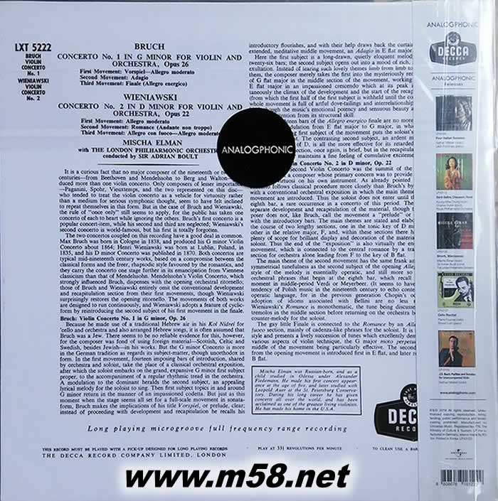布魯赫、維內(nèi)亞夫斯基小提琴協(xié)奏曲 BRUCH WIENIAUSKI 黑膠(m58.net) 鮑爾特指揮/倫敦愛樂樂團(tuán)。埃爾曼抒情精致的琴聲勾起人們對(duì)十八、十九世紀(jì)田園牧歌生活般詩意浪漫的回憶和向往。180克黑膠,純模擬制作。