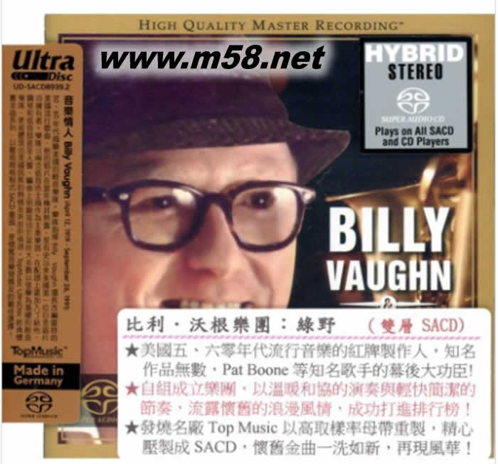 價(jià)格為估,以實(shí)到貨為準(zhǔn)! BILLY VAUGHN & HIS ORCHESTRA GREENFIELDS 綠野 SACD(m58.net) 利沃恩是20世紀(jì)50年代到60年代初最有名氣的流行管弦樂隊(duì)指揮和流行音樂編曲家。事實(shí)上,他在那個(gè)搖滾年代中,比其他的管弦樂指揮大師擁有更多的頂尖作品。比利沃恩同時(shí)也在Dot Records創(chuàng)作了眾多標(biāo)志性的作品,比如說:Pat Boone、the Fontane Sisters,還有Gale Storm。作為一名流行樂編曲家,他最大的特點(diǎn)就是干凈利落地把搖滾歌曲或R&B歌曲改編成主流樂曲。BillyVaughn也是一位錄音藝術(shù)家,他錄制了大量的輕音樂,器樂曲的專輯,這些專輯在整個(gè)60年代里都頗為流行。比利 沃恩從1952年開始了他成功的音樂生涯,于Don McGuire, Jimmy Sacca,以及Seymour Speigelman組成了一個(gè)四重唱的聲樂小組Hilltoppers。在1952年到1957年間,Hilltoppers擁有了大量的上榜單曲, Vaughn的“Trying”是他們這一系列成功的開始。在1955年,Vaughn離開了這個(gè)演唱小組,作為一名音樂導(dǎo)演參加了Dot Records。DotRecords在50年代流行的音樂,大部分都應(yīng)歸功于沃恩,他重新編排了那些搖滾樂曲和R&B樂曲,使他們擁有了主流音樂的第二次生命。他在與Fontane Sisters的合作中取得了第一次的成功,她們演唱了Vaughn管弦樂隊(duì)所有的歌曲,包括1954年突破性歌曲"Hearts of Stone"。當(dāng)然 Dot Records的最大成功是來自于Pat Boone。他擁有一系列由Vaughn重新改編的搖滾歌曲。
