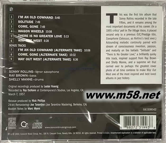 西方的出路 Way Out West(m58.net) Sonny Rollins是美國(guó)爵士次中音薩克斯風(fēng)演奏者,同時(shí)也是作曲家與樂(lè)團(tuán)指揮。他在現(xiàn)代爵士樂(lè)界扮演指導(dǎo)者角色,對(duì)后輩影響很大,最拿手的是以波普爵士樂(lè)為主 這張可以說(shuō)是Sonny的顛峰之作。 Sonny Rollins是爵士音樂(lè)史上負(fù)盛名的硬波普薩克斯手,在其著名的硬波普專(zhuān)輯《way out west》的封面上他以?shī)A著薩克斯的牛仔形象出現(xiàn),從此便在樂(lè)迷心中烙上硬朗、不羈的形象。自50年代成名以來(lái),Sonny Rollins錄制了數(shù)十張專(zhuān)輯,大多數(shù)為波普/硬波普的風(fēng)格。 Sonny Rollins的一生都在給我們驚喜,從技術(shù)上講,他是一個(gè)嫻熟而高超的硬波普薩克斯手,可貴的是他總能發(fā)現(xiàn)別的硬破普樂(lè)手不以為意的東西。錄制這張專(zhuān)輯的時(shí)候老Sonny已經(jīng)年近古稀,我不能不對(duì)一個(gè)70歲仍能在次中音薩克斯上自由翱翔的人肅然起敬,更何況他還能對(duì)自己熟稔并且為他帶來(lái)巨大榮耀的音樂(lè)做出創(chuàng)新。 Sonny Rollins是美國(guó)爵士次中音薩克斯風(fēng)演奏者,同時(shí)也是作曲家與樂(lè)團(tuán)指揮。他在現(xiàn)代爵士樂(lè)界扮演指導(dǎo)者角色,對(duì)后輩影響很大,最拿手的是以波普爵士樂(lè)為主 西方之路-這張專(zhuān)輯是Sonny Rollins於1957年3月加入Max Roach五重奏時(shí)所產(chǎn)生的一些感受。而紐約的年輕人很多是在西部片的伴隨下成長(zhǎng)的,他對(duì)〔西方之路〕這個(gè)想法感到欣喜,並將它融入Shelly Manne的性格而從音樂(lè)裏傳達(dá)出Sonny Rollins對(duì)於身處西部的感受。 另外"There Is No Grester Love"成了一首情歌,連桑尼的音都變得飽滿而溫潤(rùn),這次獨(dú)特的樂(lè)器編制,讓這三人的感情得到了完全的抒發(fā),對(duì)聽(tīng)眾而言,這是一次絕無(wú)僅有的機(jī)會(huì),同時(shí)體驗(yàn)二位出眾的爵士名家,這張專(zhuān)輯也讓你能夠神遊廣大的美國(guó)大西部所帶給我們美好的回憶。 1955年的某天,為Chet Baker和Stan Getz等西海岸爵士樂(lè)手拍照片的著名攝影師William Claxton把初到西部的Sonny Rollins帶到沙漠,給了他一頂牛仔帽,具體而微地為Sonny刻畫(huà)了他所喜歡的西部。于是,這張印有詼諧卻透著昂然生命力的牛仔形象的專(zhuān)輯封面就伴隨著“Way Out West”的名字獲了許多獎(jiǎng)。 你能想象一張連封面都是經(jīng)典的專(zhuān)輯,里面的樂(lè)曲會(huì)是何種樣貌么?在著名的I'm An Old Cowhand里,Shelly Manne用鼓點(diǎn)塑造出韃韃的聲響,令人不由地想起西部片里飛揚(yáng)的馬蹄和滾滾的黃沙,而Sonny就像電影里的主角一樣,時(shí)而在馬鞍上歡愉地小跳,時(shí)而又大跨步地前進(jìn)著,吹奏聲不絕于耳,不斷地突進(jìn),勃勃的生機(jī)撲面而來(lái),讓我不斷感嘆Way Out West這個(gè)名字叫得可真是好! Sonny在那時(shí)候還不過(guò)是個(gè)前景矚目的新秀,可是他對(duì)于傳統(tǒng)和弦結(jié)構(gòu)的顛覆,以及毫不拘束的變奏手法使得彼時(shí)已是名家Shelly Manne和Ray Brown深受吸引。這從未一起演奏過(guò)的三人連續(xù)從下午3點(diǎn)一直工作到7點(diǎn),盡管疲倦?yún)s仍然興致高漲。從Sonny的tenor sax里出來(lái)的那些聽(tīng)上去有點(diǎn)刺耳的高音,斷句清晰明確,帶著亮堂堂、熱烘烘的感染力,讓聽(tīng)者的耳朵處于亢奮的狀態(tài)。大段大段隨意揮灑的solo,將硬波普的熱情和彈性宣泄得一覽無(wú)遺。 在There Is No Greater Love里,Sonny對(duì)Shelly Manne和Ray Brown不斷重復(fù)著歌詞,把氣氛搞得甜膩又迷人,他自己也一反干脆利落的常態(tài),變得飽滿而溫柔,大大地芭樂(lè)了一把。 聽(tīng)完整張專(zhuān)輯以后,我不禁佩服起將Sonny帶到沙漠,并為他塑造牛仔形象的William Claxton,他用西部的地理風(fēng)貌,來(lái)拆解音樂(lè)語(yǔ)境里的涵義,如此準(zhǔn)確地表達(dá)出Sonny由于受到當(dāng)時(shí)風(fēng)靡的西部片的影響,對(duì)“向西部進(jìn)發(fā)”而感到的欣喜;以及他在第一次西行加入Max Roach五重奏樂(lè)隊(duì)后,對(duì)于爵士音樂(lè)和生活的一些共通的感受