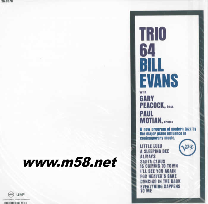 Bill Evans Trio (爵士三重奏 鋼琴、貝斯、鼓) 64 黑膠(m58.net) 擁有“爵士鋼琴詩人”美譽之稱的比爾‧艾文斯,出道之際即以融合古典音樂印象派指標人物德布西及拉威爾的彈奏技法一新樂壇耳目,其無盡演繹里始終載滿著無限延伸的深沈意境,再透過其錯落觸鍵所勾勒之樸拙質感或迷濛氛圍,於強調速度及力度的精純咆勃樂風當道時期而顯得獨樹一幟