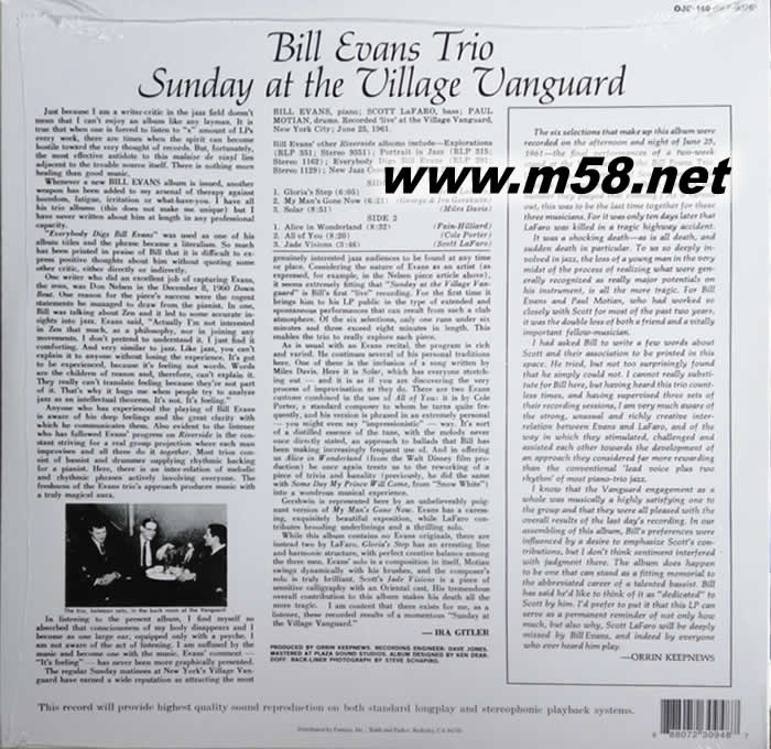 鋼琴詩人 Sunday At The Village Vanguard星期天的鄉村爵士鋼琴 黑膠(m58.net) 比爾.伊文思三重奏 LP,這張在Village Vanguard的錄制的專輯,被譽為有史以來最偉大的爵士專輯之一。也被稱為最好的爵士現場專輯之一。Penguin Guide to Jazz、The Rolling Stone Jazz Record Guide都給了5星