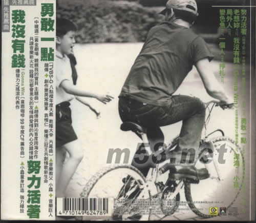 勇敢一點(m58.net) 黃金打造10首全主打專輯 努力的歌絕對動聽 勇敢一點[TVDS-G八點檔年度大戲 乾隆大帝 片尾曲]音樂教父小蟲+音樂巨人趙傳+創(chuàng)作票房常勝軍 袁惟仁 樂壇三冠王共創(chuàng)情歌新生命[中視過二黃金劇場親親我的寶貝 主題曲]趙傳與劉沁首度跨海合作共譜音樂新火花詮釋出都會男女的友情與愛情的內心交錯情緒努力活著 我沒有錢I GONNA WIN[韋恩咖啡99年度CF廣告曲]小蟲量身訂造強力釋放爆發(fā)力之搖滾代表作