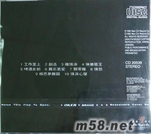 01. 工作至上 02. 創(chuàng)造 03. 離情淚 04. 快樂歌王 05. 啤酒女郎 06. 難忘舊愛 07. 飄零雁 08. 情怨 09. 相思?jí)綦y圓 10. 情淚心聲