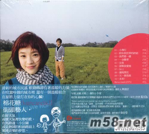 小飛行 (臺(tái)灣版)(m58.net) 棉花糖[katncandix2],西元二○○七年五月三十日,街頭出生。 一男一女。 清新的城市民謠,軟棉棉卻有著溫暖的力量。 藉由他們的文字和旋律,將帶離城市的喧囂。閉上眼睛,感受音樂的單純和夢(mèng)想。 西元二○○九年,棉花糖[katncandix2] 首張創(chuàng)作專輯 《小飛行》,起飛準(zhǔn)備。 這是新專輯預(yù)購活動(dòng)的第一站, 邀請(qǐng)你一起搭上我們的飛行旅程。你將會(huì)發(fā)現(xiàn)你的淚水和勇敢,原來是這么珍貴並巨大。 歡迎來到做夢(mèng)的大世紀(jì) 沒有輸贏。