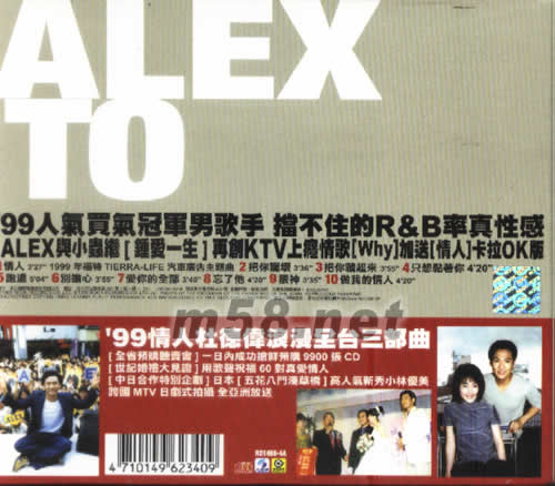 99情人杜德偉(m58.net) 99人氣買氣冠軍男歌手 情歌盟主三周暢銷30萬張不只臺灣溺愛 ALEX進(jìn)軍日本樂壇首步曲[WHY]中文搶聽版 慶功收錄 新包裝 1+1CD ALEX TO 99情人杜德偉 99全新國語專輯 小蟲音樂制作日本 [五花八門淺草橋]高人氣新秀 小林優(yōu)美跨國 MTV合作 日本傳媒破天荒衡星追蹤特別企劃 TVBS八點(diǎn)檔 [聊齋]片頭曲 [把你藏起來] 福特TIERRA-LIFE汽車廣告曲[情人] 三立都會臺港劇[真愛]片頭片尾曲[WHY][把你龐壞] 內(nèi)附L.A寫真POST CARDS 99人氣買氣冠軍男歌手 擋不住的R&B率真性感ALEX與小蟲繼[鐘愛一生]再創(chuàng)KTV上癮情歌[WHY]加送[情人]卡拉OK版 99情人杜德偉浪漫全臺三部曲 [全省預(yù)購聽賣會]一日內(nèi)成功搶鮮預(yù)購9900張CD [世紀(jì)婚禮大見證]用歌聲祝福60對真愛情人 [中日合作特別企劃]日本[五花八門淺草橋]高人氣新秀小林優(yōu)美跨國MTV日劇式拍攝 全亞洲放送