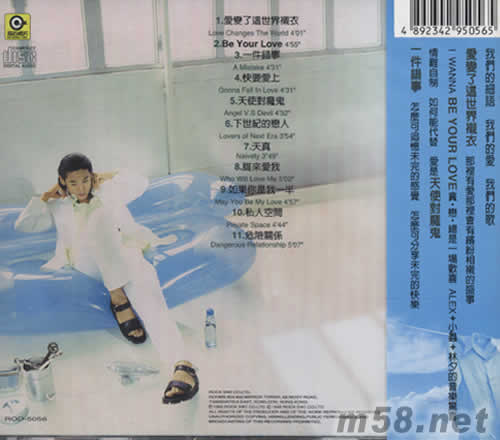 1、愛(ài)變了這世界新衣 LOVE CHANGES THE WORLD 2、BE YOUR LOVE 3、一件錯(cuò)事 A MISTAKE 4、快要愛(ài)上 GONNA FALL IN LOVE 5、天使對(duì)魔鬼 ANGEL V。S DEVIL 6、下世紀(jì)的戀人 LOVERS OF NEXT ERA 7、天真 NAIVETY 8、誰(shuí)來(lái)愛(ài)我 WHO WILL LOVE ME 9、如果你是我一半 MAY YOU BE MY LOVE 10、私人空間 PRIVATE SPACE 11、危險(xiǎn)關(guān)系 DANGEROUS REIATIONSHIP