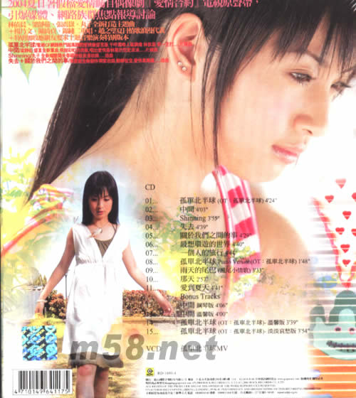 CD 01. 孤單北半球 02. 中間 03. Shinning 04. 失去 05. 關(guān)于我們之間的事 06. 最想環(huán)游的世界 07. 一個(gè)人的旅行 08. 孤單北半球 09. 雨天的尾巴 10. 那天 11. 愛到夏天 12. 中間 - 鋼琴版 13. 中間 - 溫馨版 14. 孤單北半球 - 溫馨版 15. 孤單北半球 - 淡淡哀愁版 VCD 孤單北半球 MV