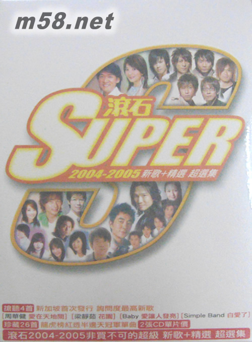 價格為估,以實到貨為準! 滾石SUPER 2004-2005新歌+精選 超選集(m58.net) 滾石旗下的《Super》精選輯,選曲一向都不錯,這次也不例外,只要是大Hit的,都榜上有名,比如《孤單北半球》、《脫掉》、《手放開》、《寧夏》、《倔強》、《明明很愛你》等等,都是去年至今膾炙人口的作品。 除了25首精選作品,這張精選輯還收錄了5首新歌,計有品冠的《美味關系》、年少的《I've Got Something To Say》、梁靜茹的《花園》、周華健的《愛在天地間》,以及臺灣新晉樂團Simple Band的《白愛了》,讓樂迷先聽為快。
